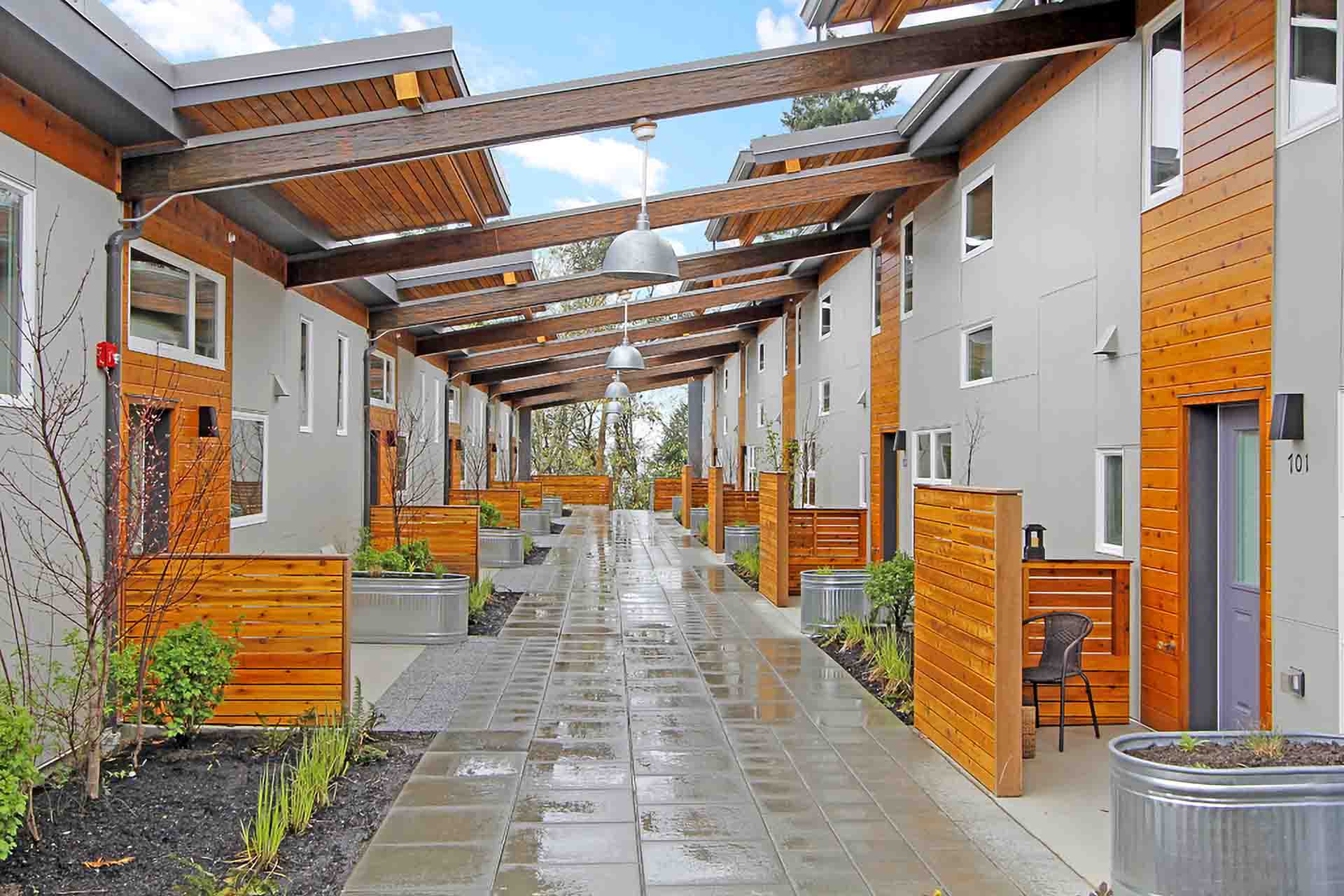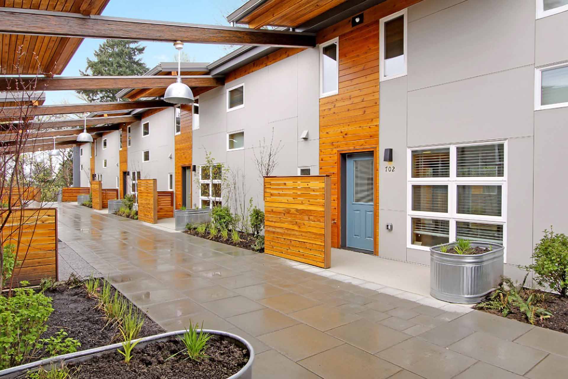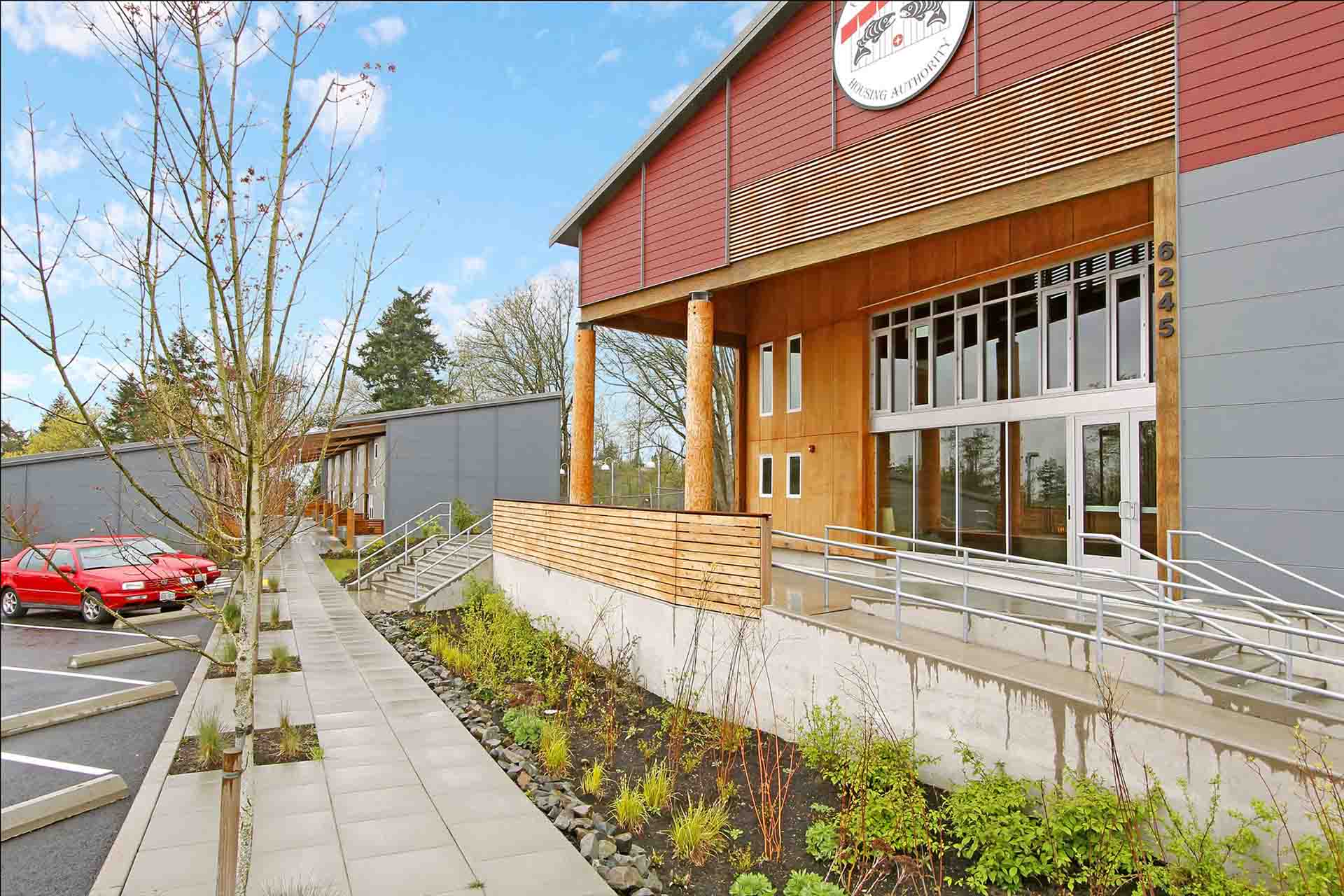 The Puyallup Tribal Housing Authority developed the Longhouse (Place of Hidden Waters) in Tacoma, WA as a culturally significant and energy-efficient affordable housing project. Inspired by the traditional shed-roofed Coast Salish longhouse, the design incorporates a modern townhouse courtyard layout while honoring community heritage. The project includes two 10-unit super-insulated townhome clusters, a major renovation and addition to an existing gymnasium, a sweat lodge enclosure with a fire pit, and a landscaped 5-acre wildlife park. A key goal was to create low-energy, low-cost homes that could serve as a model for future tribal housing developments in the region.