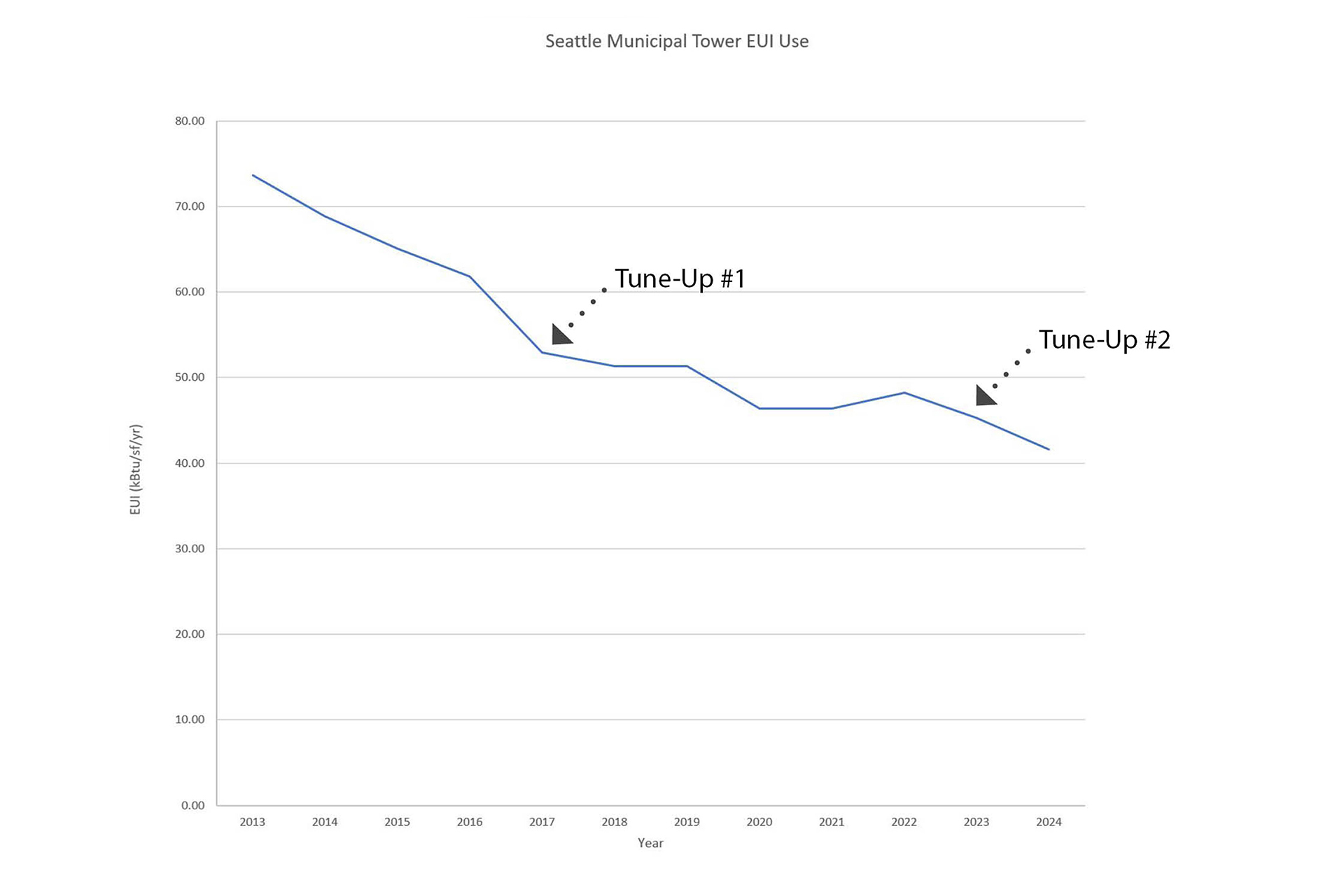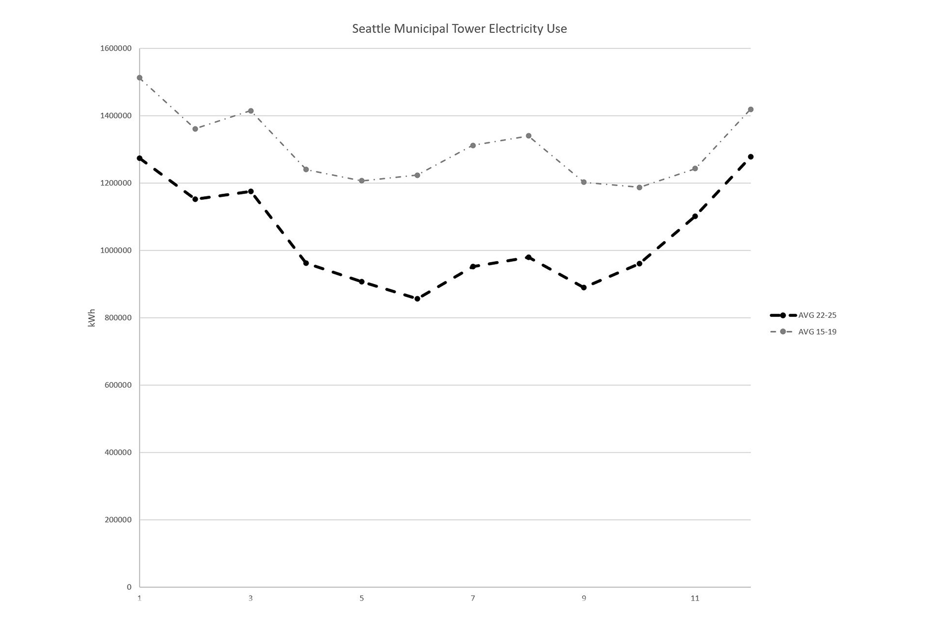 As part of the City of Seattle’s broader Municipal Portfolio Energy Performance & Decarbonization efforts, Ecotope has supported the Seattle Municipal Tower—a 1,000,000 SF high-rise office building—in achieving meaningful energy savings and full electrification. Through two building tune-ups (in 2017 and 2023), Ecotope identified and helped implement low- and no-cost operational improvements that significantly reduced energy use without requiring major capital investment. These measures, including controls optimization, lighting upgrades, and equipment scheduling, laid the groundwork for deeper decarbonization efforts. Over time, strategic system replacements—like a chiller plant upgrade and server room decommissioning—contributed further efficiency gains.